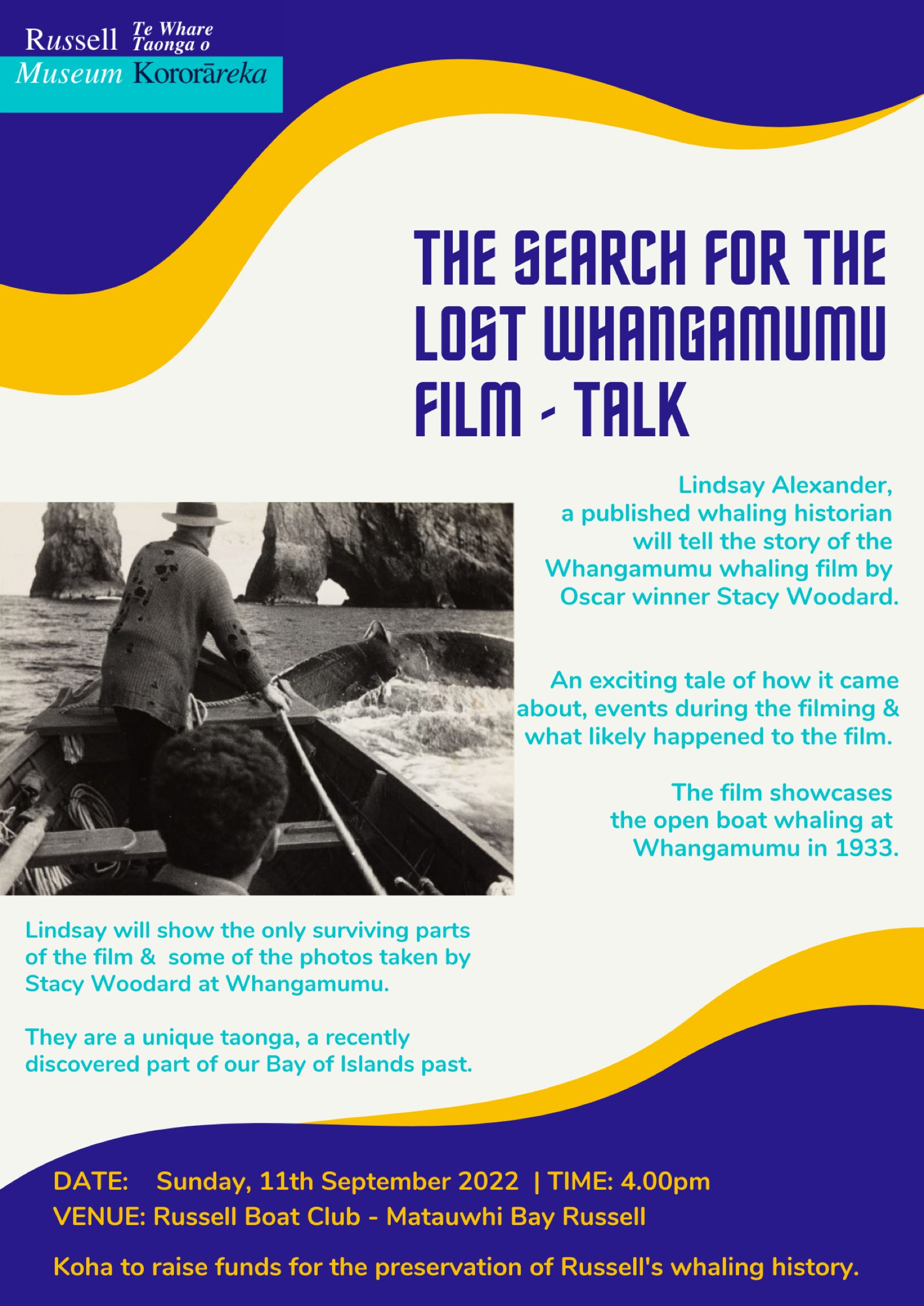 Lindsay Alexander, a published whaling historian will tell the story of the Whangamumu whaling film by Oscar winner Stacy Woodard.
